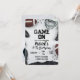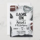 A stylish American football–themed birthday invitation with a clean white background and a vertical layout. The design features bold black varsity-style text reading “GAME ON” at the center. Below, elegant handwritten-style lettering invites guests to celebrate a child’s birthday. Realistic American footballs are placed around the edges, along with detailed football gear including a helmet, cleats, and a jersey. Subtle hand-drawn football play symbols (X’s, O’s, arrows, and lines) are scattered across the background, adding a playful sports strategy feel.