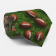 A repeating pattern of brown, textured American footballs with white laces is displayed on a background of green, textured grass. The footballs are evenly distributed and oriented in various directions, creating a continuous and seamless design. The pattern is visually consistent, with each football and blade of grass rendered in detail. Perfect for sports enthusiasts.