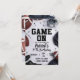 A stylish American football–themed birthday invitation with a clean white background and a vertical layout. The design features bold black varsity-style text reading “GAME ON” at the center. Below, elegant handwritten-style lettering invites guests to celebrate a child’s birthday. Realistic American footballs are placed around the edges, along with detailed football gear including a helmet, cleats, and a jersey. Subtle hand-drawn football play symbols (X’s, O’s, arrows, and lines) are scattered across the background, adding a playful sports strategy feel.