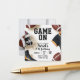 A stylish American football–themed birthday invitation with a clean white background and a vertical layout. The design features bold black varsity-style text reading “GAME ON” at the center. Below, elegant handwritten-style lettering invites guests to celebrate a child’s birthday. Realistic American footballs are placed around the edges, along with detailed football gear including a helmet, cleats, and a jersey. Subtle hand-drawn football play symbols (X’s, O’s, arrows, and lines) are scattered across the background, adding a playful sports strategy feel.