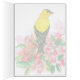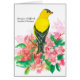 A blank greeting card decorated with a bright yellow and black American Goldfinch bird perched on a pretty pink rhododendron flowering bush inspired by the State of Washington bird and flower painted with watercolor.