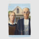 This is the classic Grant Wood painting, American Gothic, showing a farmer and his wife standing in front of their farmhouse, he with his pitchfork, her looking sidways at him.