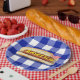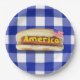 Hot dog with America text in mustard on blue and white buffalo plaid for 4th of July or any other patriotic American holiday.
