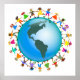 Cute cartoon illustration of a group of happy and diverse boys and girls holding hands around a globe with a map of North and South America. Image available on various gifts and products. Customise if you prefer and change the background colour or add some text.