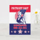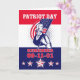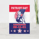 Poster greeting card illustration of a patriot minuteman revolutionary soldier holding an American stars and stripes flag and words patriot day remember september 11, 2001.