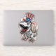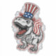 American Patriotic Dinosaur, a captivating and vibrant illustration of a cartoonish, vector art-style design of ferocious dinosaur with a cute playful demeanour. The dinosaur is depicted with its mouth wide open to reveal its teeth cute for kids. Perched atop its head is an amusingly patriotic top hat adorned with the stars and stripes of the American flag. The dinosaur itself is rendered in striking white, contrasting sharply with the black background. The hat, featuring red and white stripes with white stars on a blue field, adds an unexpected and whimsical patriotic touch. The illustrated figure and hat are defined by bold outlines that draw the viewer's attention, creating a playful yet animated atmosphere. The unique combination of elements in this design results in a humourous and lively image that is sure to delight viewers.
