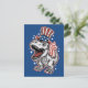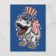 American Patriotic Dinosaur, a captivating and vibrant illustration of a cartoonish, vector art-style design of ferocious dinosaur with a cute playful demeanour. The dinosaur is depicted with its mouth wide open to reveal its teeth cute for kids. Perched atop its head is an amusingly patriotic top hat adorned with the stars and stripes of the American flag. The dinosaur itself is rendered in striking white, contrasting sharply with the black background. The hat, featuring red and white stripes with white stars on a blue field, adds an unexpected and whimsical patriotic touch. The illustrated figure and hat are defined by bold outlines that draw the viewer's attention, creating a playful yet animated atmosphere. The unique combination of elements in this design results in a humourous and lively image that is sure to delight viewers.
