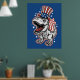 American Patriotic Dinosaur, a captivating and vibrant illustration of a cartoonish, vector art-style design of ferocious dinosaur with a cute playful demeanour. The dinosaur is depicted with its mouth wide open to reveal its teeth cute for kids. Perched atop its head is an amusingly patriotic top hat adorned with the stars and stripes of the American flag. The dinosaur itself is rendered in striking white, contrasting sharply with the black background. The hat, featuring red and white stripes with white stars on a blue field, adds an unexpected and whimsical patriotic touch. The illustrated figure and hat are defined by bold outlines that draw the viewer's attention, creating a playful yet animated atmosphere. The unique combination of elements in this design results in a humourous and lively image that is sure to delight viewers.
