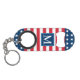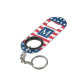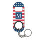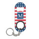 This patriotic monogrammed bottle opener keychain features a United States of America flag inspired design with stars and stripes in classic red, white, and blue American colours. Personalise the custom monogram with your family's last name initial letter.