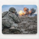 An American soldier in camouflage aims his rifle towards a distant explosion, capturing the tension of a dynamic military operation