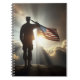 A silhouette of a soldier saluting an American flag with dramatic sunbeams.