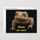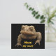 A grumpy looking American Toad (Bufo americanus) is looking out at you from the front of this postcard. This small amphibian is brown with black, gold olive green and orange coloration. His warts distinguish him from his frog neighbours. Although hatched in the water of ponds, rivers, lakes or streams, the tadpoles soon move to land where the toads live their adult lives. His startling call is a long screech. He looks quite fierce but is actually a gentle little guy who eat lots of garden pests including insects and slugs. The text reads: Make my day ! It can be customised or removed.
