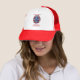 An American trucker hat is a type of cap that combines a classic, structured design with a distinctive, breatheable mesh back. It typically features a bold or patriotic theme, often showcasing the American flag, U.S. symbols, or graphic designs that evoke a sense of American pride. The hat is known for its rugged, casual style, making it a popular accessory for outdoor activities, sports, and streetwear