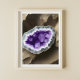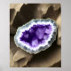 Amazing photorealistic AI generated digital art features open geode with beautiful amethyst crystals.