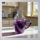 Artwork of a cup made from amethyst crystal. A captivating painting that celebrates the quiet luxury of a sunlit moment. This exquisite piece features a faceted amethyst-coloured glass mug, filled with a warm, steaming beverage, catching the morning light with dazzling brilliance. The soft steam rising from the cup adds a touch of charm, while the crisp highlights and deep shadows on the counter-top create a sense of realism. The background is a cosy kitchen bathed in natural light, inviting a feeling of peace and warmth. This artwork is a perfect addition for those who appreciate art that captures the everyday beauty of a tranquil morning, perfect for adding a touch of awe and beauty to any room. This art can be customised, printed, and or downloaded.
