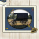 A familiar sight in Ethridge Tennessee, an Amish buggy sits peaceful and still waiting for the owner and horses to return. The oval shaped photo sits on a blue background with a white boarder and autumn leaves for accent.