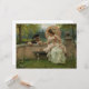 This design features a painting by the Italian artist Federico Andreotti (1847–1930). It shows an elegant young woman sitting on a stone bench in a parkland. She is talking to her male suitor, who is crouching down beside her. The two lovers are having a romantic conversation away from the prying eyes of family and friends. The lady is wearing a fashionable white dress, and she is holding a parasol to protect herself from the sun. The gentleman is also wearing a historical costume appropriate to the era. On the bench next to the young woman is a book, perhaps containing love poetry, and some pink roses, which may have been given as a given by her admirer. The couple are surrounded by beautiful verdant trees. There is also a lake or river running through the park.