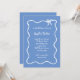 This chic and elegant bridal shower invitation features a white hand drawn, wavy illustrated frame with a bow, and stylish handwritten script on a cornflower blue background for a Parisian or French style wedding shower invitation.