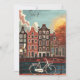An illustration of Amsterdam the capital city of The Netherlands features charming, colourful houses along a canal, a white bicycle in the foreground, and autumn trees under a blue sky with birds flying.