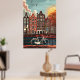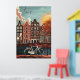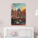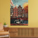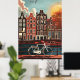 An illustration of Amsterdam the capital city of The Netherlands features charming, colourful houses along a canal, a white bicycle in the foreground, and autumn trees under a blue sky with birds flying.
