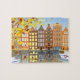 Amsterdam City Autumn Puzzle with Gift Box. Amsterdam city view (canal, houses, boats and a branch of the autumn tree with falling leaves). Autumn colour theme: yellow, orange, brown, blue.