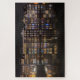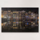 Jigsaw puzzle of traditional architecture canal houses with colourful lights and reflection in the water at night in the Red Light District in the city centre of Amsterdam, the Netherlands.