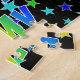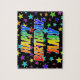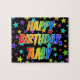 This vibrant and lively birthday-themed jigsaw puzzle design has the message "HAPPY BIRTHDAY, AMY" with the characters having a colourful rainbow spectrum inspired gradient pattern, along with an exciting star field background pattern. An exciting puzzle like this might be used to send birthday greetings to somebody named Amy. [~Z0000468]