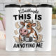This funny illustration features a grumpy-looking cow with a cup of coffee. The cow has a disgruntled expression and papers are flying around its head, suggesting a stressful work environment. The words "THIS IS ANNOYING ME" are at the top and bottom of the art, giving it a humourous and relatable feel.