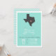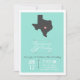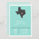 A chic aqua and white wedding invitation, featuring a grey Texas silhouette with a heart. The back of the invitation has a simple aqua and white chevron print design.