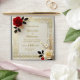 A wedding invitation in gold with a red rose symbolizing love and appreciation, and a white rose symbolizing purity of heart with the guests; customizable.