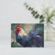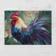 A rooster painting art that showcases a colorful rooster with a dazzling plumage of blues, purples, and greens, contrasted with a serene tropical scenery of palm trees, flowers, and a waterfall, creating a mood of calmness and exotic charm.