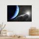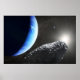 An artist's concept of Neptune's tiny moon Hippocamp that was discovered by the Hubble Space Telescope in 2013. Only 20 miles across, it may actually be a broken-off fragment from a much larger neighbouring moon, Proteus, seen as a crescent in the background. This is the first evidence for a moon being an offshoot from a comet collision with a much larger parent body.
