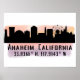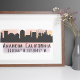 Print features Anaheim California city skyline silhouette with watercolor splash and latitude & longitude map coordinates
