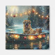 Set sail into the magic of the holiday season with this beautifully detailed illustration, showcasing a proud dog sitting in a festively decorated boat, gliding across a serene Christmas lake. The twinkling lights from nearby pine trees reflect off the water, casting a warm, festive glow that enhances the cosy ambiance. Ornaments dangle from the boat's sides, while glowing lanterns light the way, creating a scene that captures the true essence of Christmas warmth and joy. This nostalgic artwork brings a touch of holiday magic to any space, perfect for those who cherish the spirit of the season.