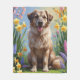 A cheerful dog sits peacefully on lush green grass, surrounded by colourful spring blooms under a soft blue sky. This digital oil painting captures a serene moment with expressive brushstrokes, warm colours, and a sense of gentle joy.