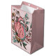 This colourful gift bag features a watercolor painting of a anatomical heart in pink and aqua blue surrounded by botanical plants on a light pink background.