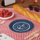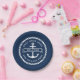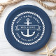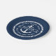 Paper plates featuring an anchor with a ribbon banner across it with customizable text "welcome". Add your boat name above and hailing port below. Around the anchor and text is a round rope border. White design on dark blue background.