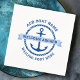 Napkins featuring a dark blue nautical anchor surrounded by a rope border on a white background. Across the anchor is a light blue ribbon with custom text "welcome aboard". Add your boat name above and hailing port below.