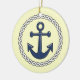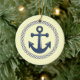 Nautically themed ceramic hanging holiday ornament has an encircled anchor.