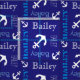 Modern text and nautical anchor design personalised boys text typographical name fabric. Simple blue graphic anchor and your own short name design. Personalise with your own name (please note not all names will fit due to the nature of the font) currently reads Bailey, other name lengths are available, if you need assistance contact me, happy to post one for your name. A great way to personalise your sewing and quilting projects. Ideal for coastal themed sewing items. Art and design by Sarah Trett.