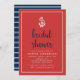 Stylish Nautical Bridal Shower invitation featuring an anchor and the words "bridal shower" in a stylish blue script against a red background with a white border. Card has a white stripes pattern against a blue background back side. Check out other wedding items here https://www.zazzle.com/rosewoodandcitrus/gifts?cg=196540141241316965&rf=238364477188679314