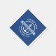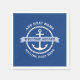 Napkins featuring a white nautical anchor surrounded by a rope border on a dark blue background. Across the anchor is a light blue banner with customisable text "welcome aboard". Add your boat's name and hailing port.
