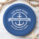 Paper plate featuring a white nautical anchor surrounded by a rope border on a dark blue background. Across the anchor is a light blue banner with customisable text "welcome aboard". Add your boat's name and hailing port.