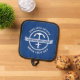 Pot holder featuring a white nautical anchor surrounded by a rope border on a dark blue background. Across the anchor is a light blue banner with customisable text "welcome aboard". Add your boat's name and hailing port.