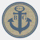 Blue anchor nautical style in navy blue over the rustic look of burlap. Ocean or beach theme wedding sticker, "Anchored with Love".