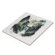 A beautiful ceramic tile showing an ink illustration of a landscape with ancient Chinese architecture and majestic waterfalls.