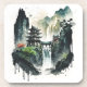 A beautiful set of hard plastic coasters showing an ink illustration of a landscape with ancient Chinese architecture and majestic waterfalls.