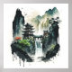 A beautiful square poster showing an ink illustration of a landscape with ancient Chinese architecture and majestic waterfalls.