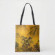 This artistic tote bag features an impression of an ancient Chinese landscape. Trees are in the foreground and mountains loom in the distance. The autumn colours are gold, yellow, orange, green, brown and black.