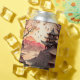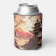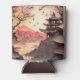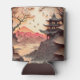 A beautiful brown can cooler with a paper cutout scene depicting ancient Chinese building, trees, mountains and lake.